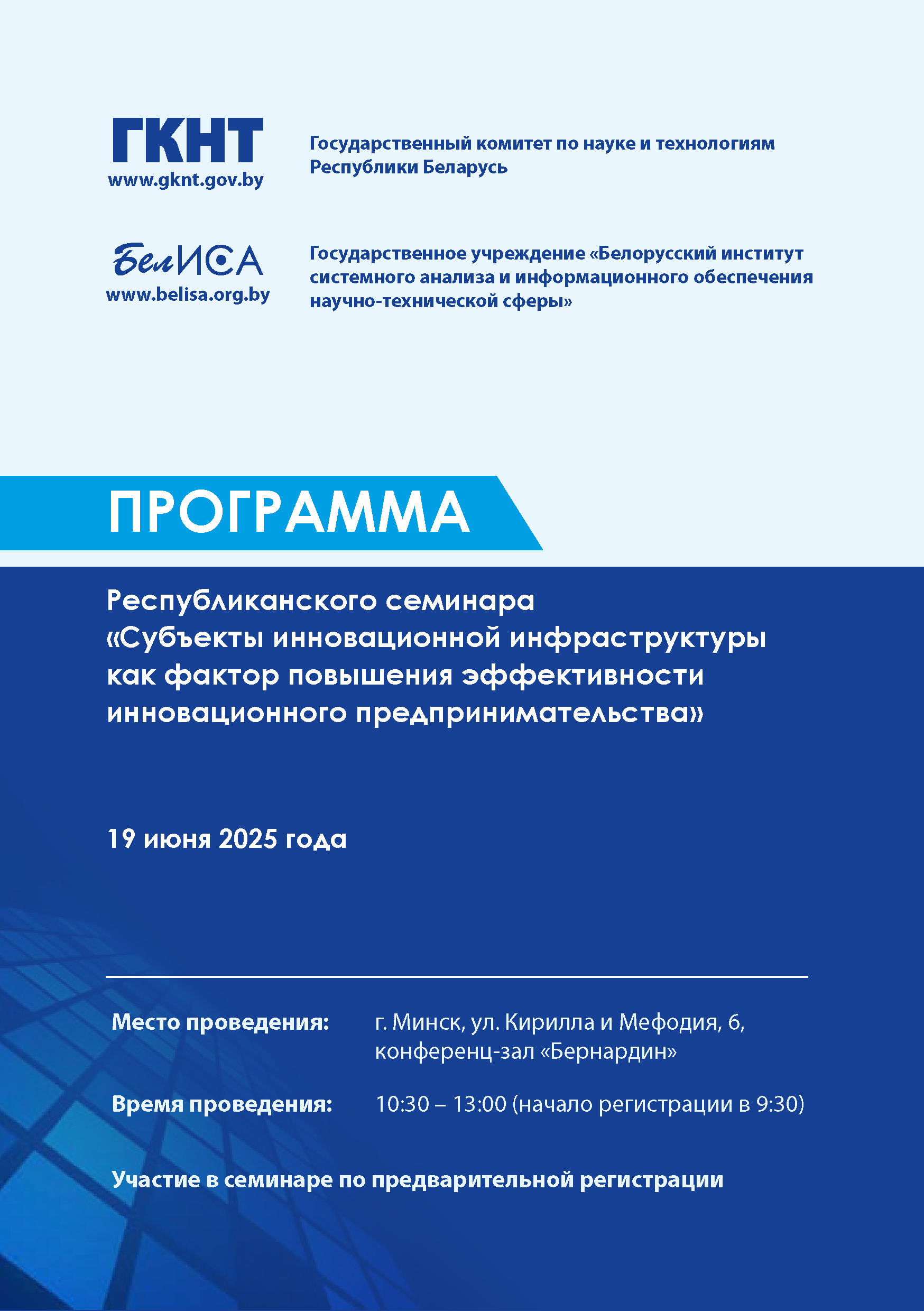 Государственным комитетом по науке и технологиям Республики Беларусь совместно с государственным учреждением «Белорусский институт системного анализа и информационного обеспечения научно-технической сферы» в целях формирования и развития компетенций в области обеспечения деятельности субъектов инновационной инфраструктуры 19 июня 2025 г. проводится республиканский семинар «Субъекты инновационной инфраструктуры как фактор повышения эффективности инновационного предпринимательства».